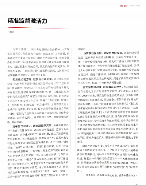 湖北经济学院纪委、监察专员办通过将政治监督精准嵌入智库研究关键环节,不仅保障了国家重大战略在高校的贯彻执行,更畅通了学术研究向决策咨询转化的渠道,探索出一条高校纪检监察工作与学术优势深度融合、协同服务经济社会高质量发展的有效路径,为长江经济带高质量发展贡献了独特的“经院智慧”与“纪检力量”。